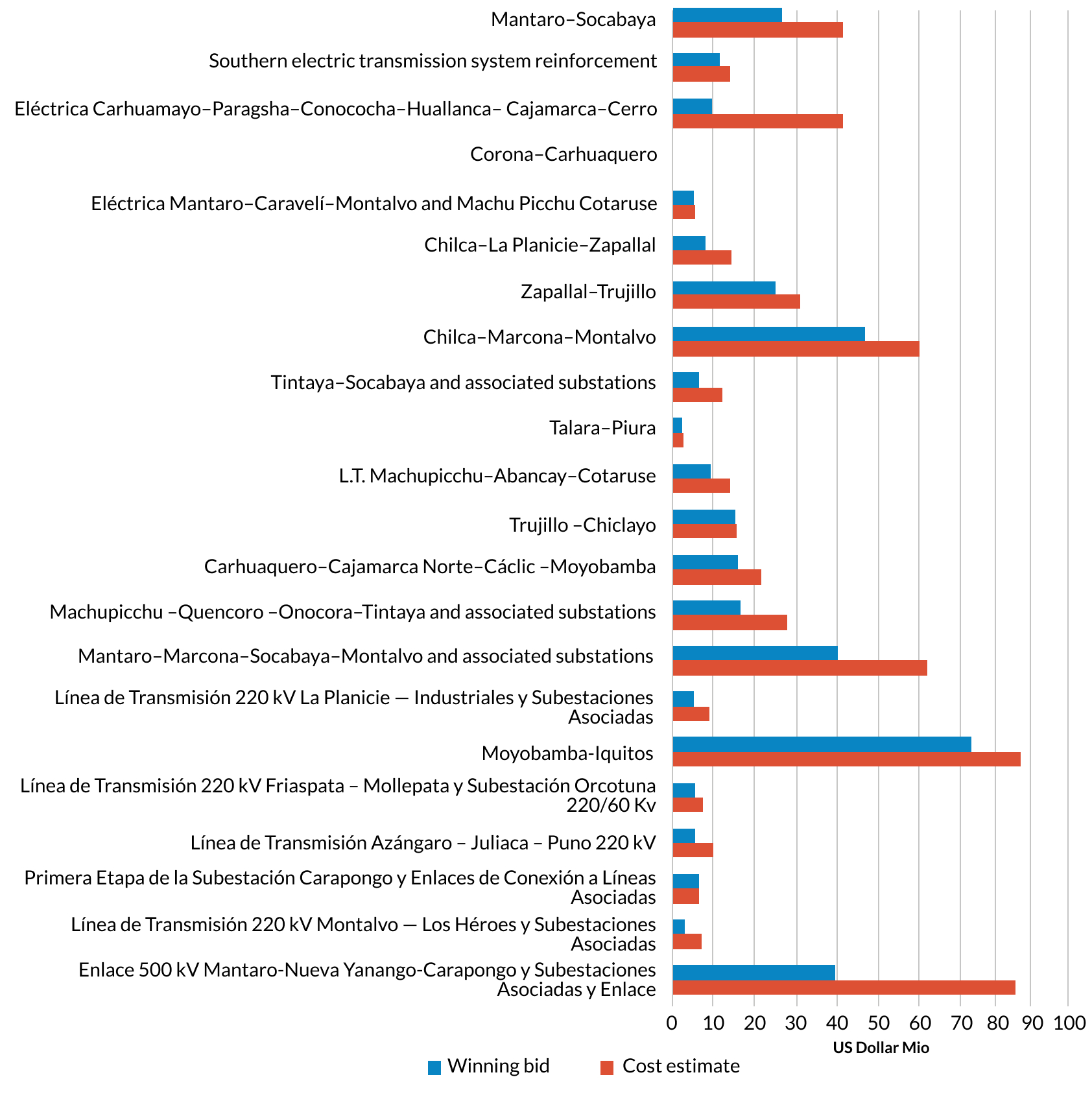An important conclusion that can be drawn from the Peruvian experience is that privately financed projects have been implemented at a fraction of the expected cost. The experience in other countries (e.g., Brazil and India) were similar. As an illustration of this, Figure 5.3 below shows that the winning bids in Peru provide significant savings to the electricity sector versus projected costs (an average of 36% lower).